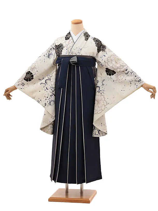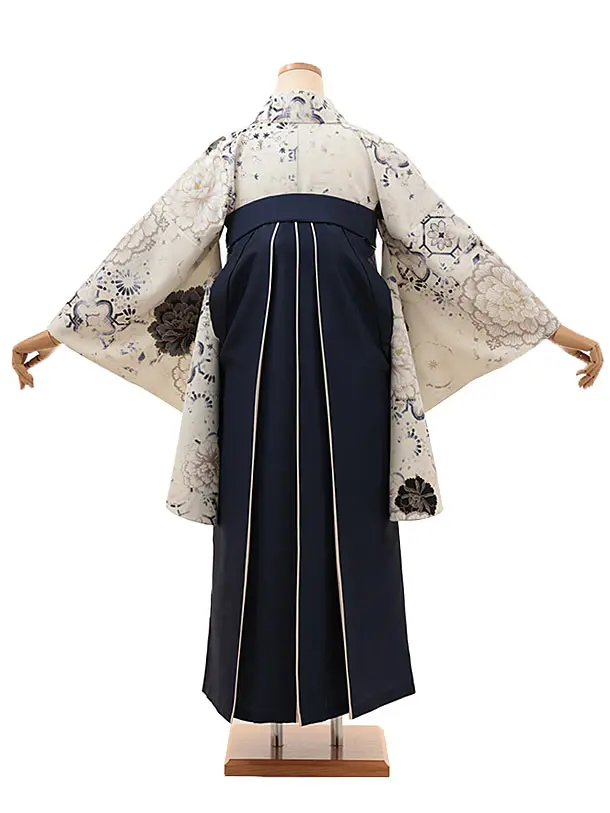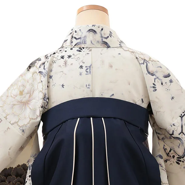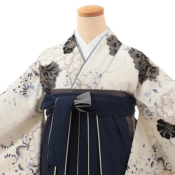 卒業式袴レンタルV289 オフホワイト 牡丹×紺アイボリー