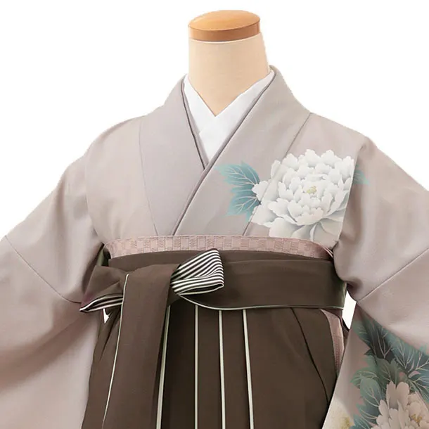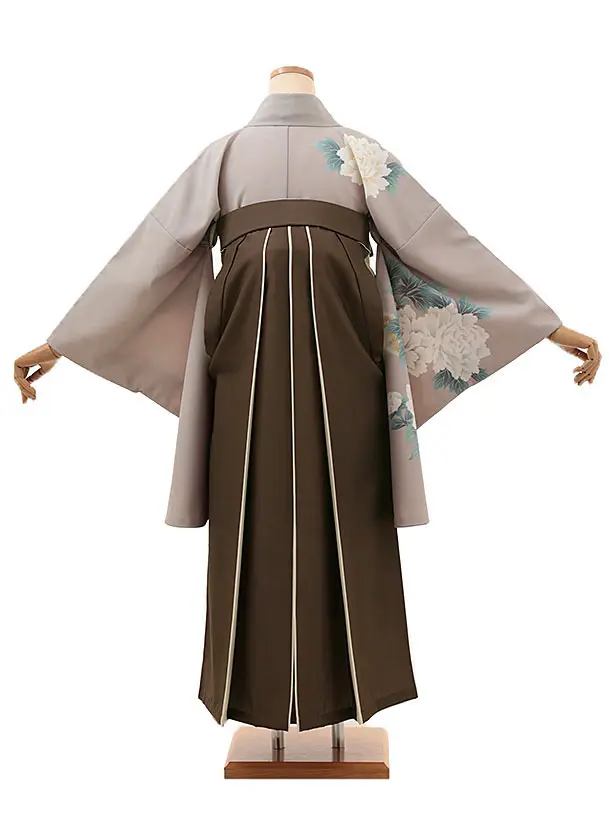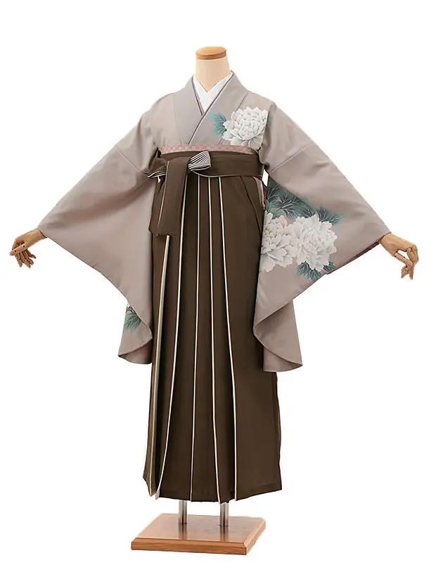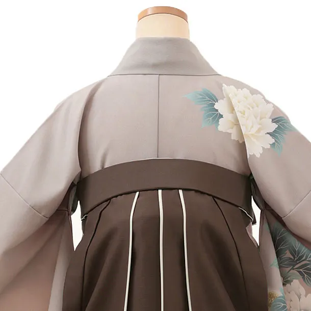 卒業式袴レンタルV299 グレージュ牡丹×ブラウンアイボリー