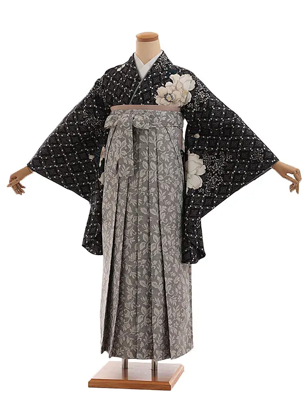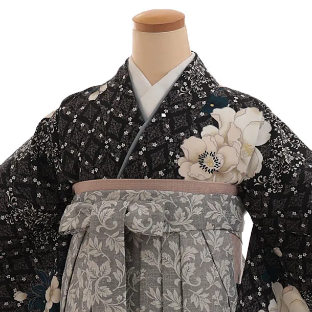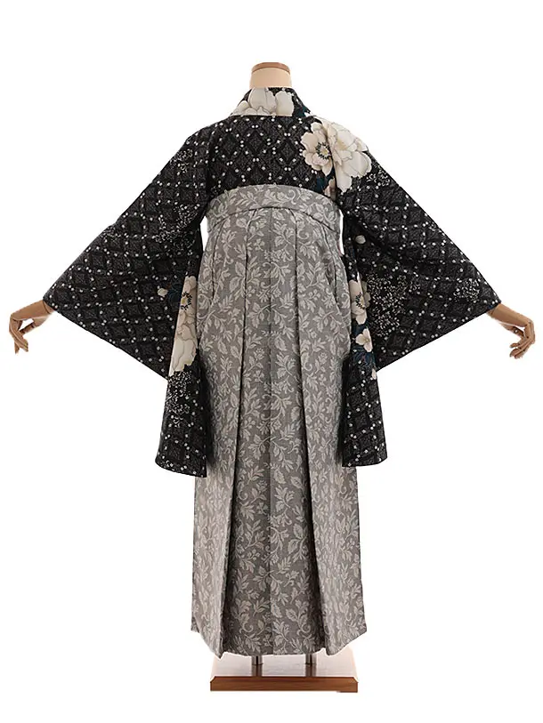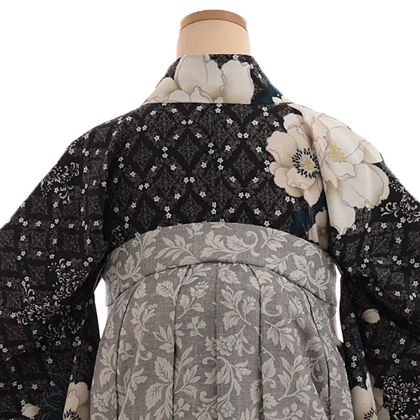 卒業式袴レンタルV309 黒 ダマスク 花×グレー小花