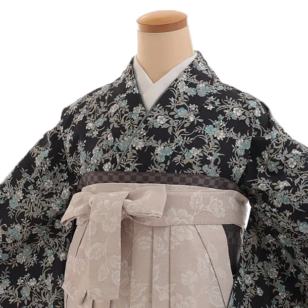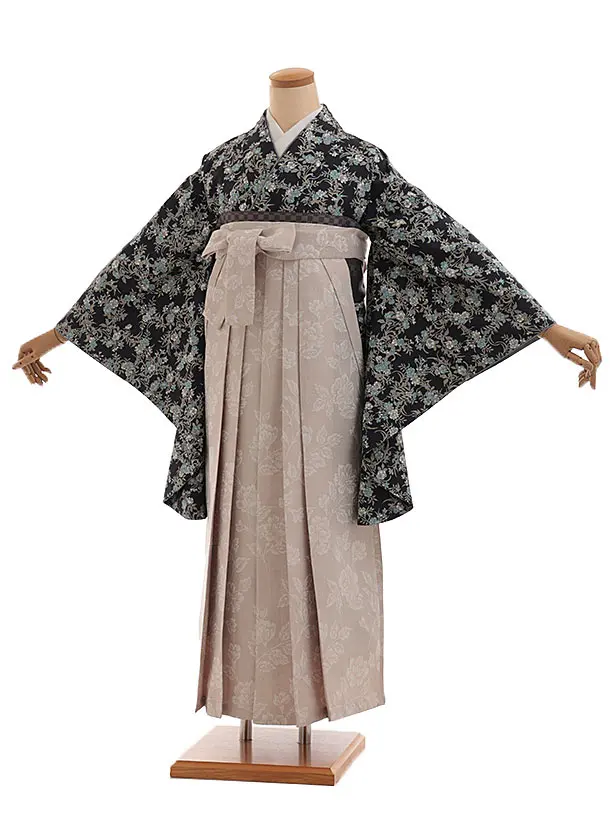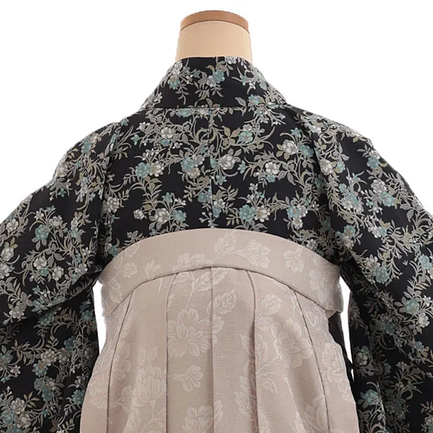 卒業式袴レンタルV317 紺地 小花×ピンクベージュ花