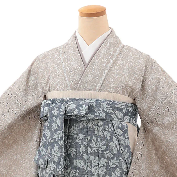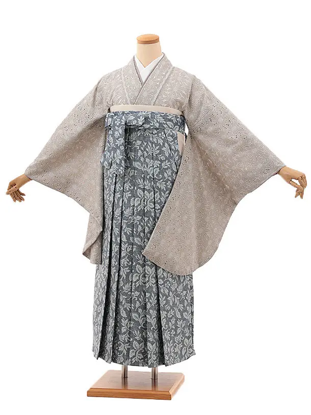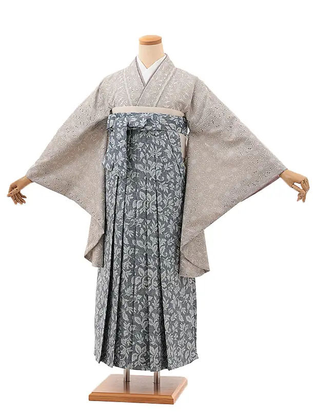 卒業式袴レンタルV329 グレージュレース×ブルー花
