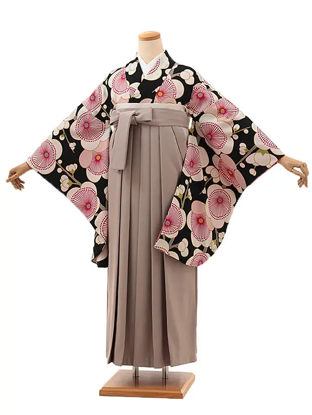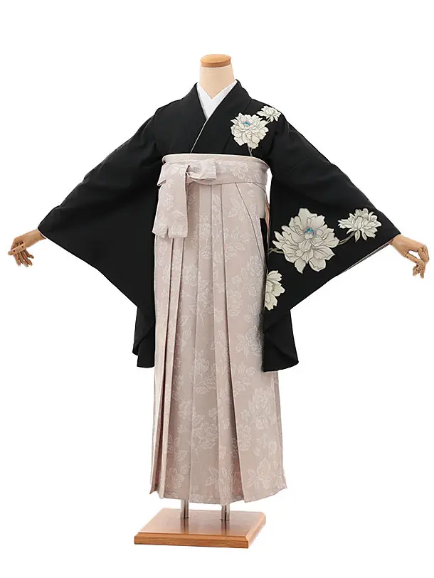 卒業式袴レンタルV336 黒地 花×ピンクベージュ花