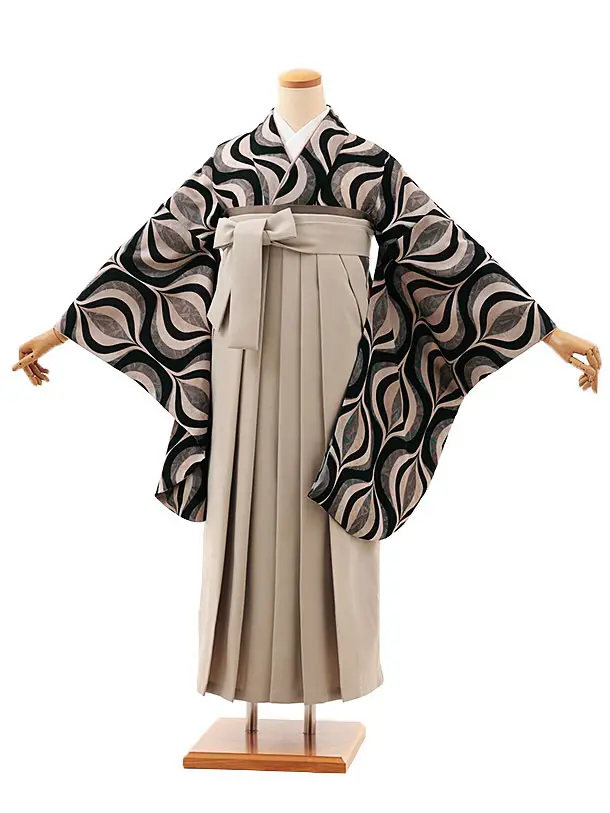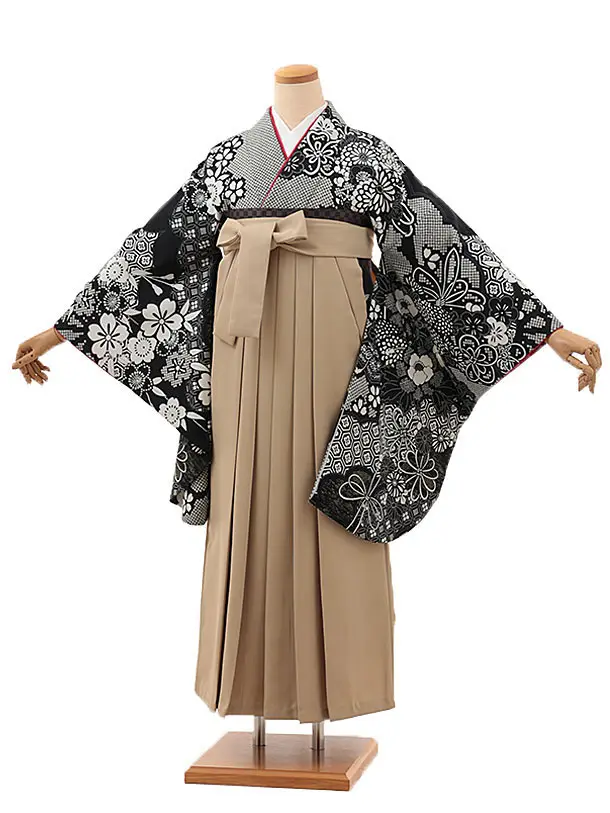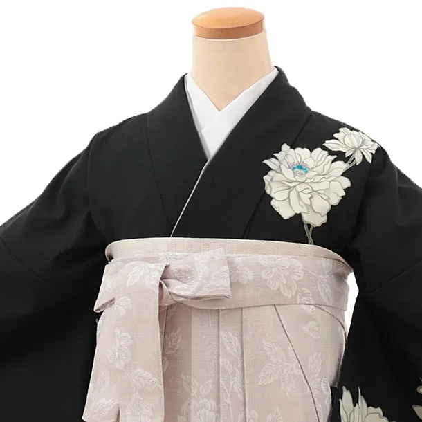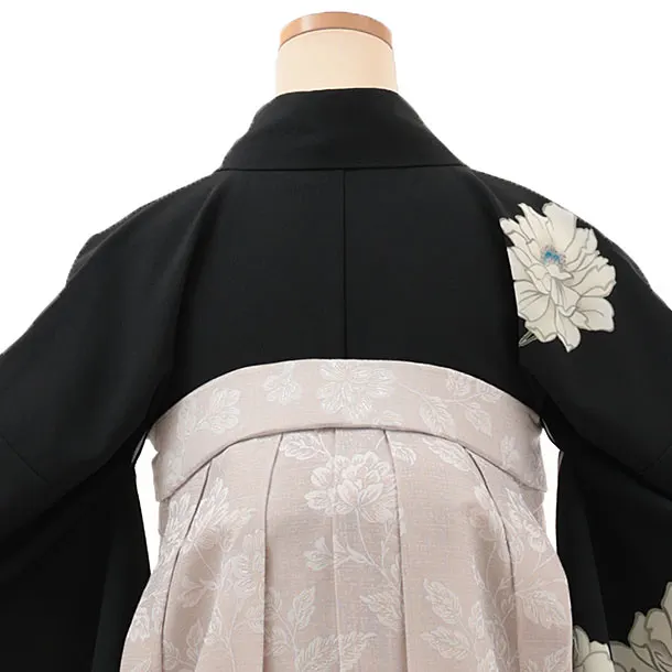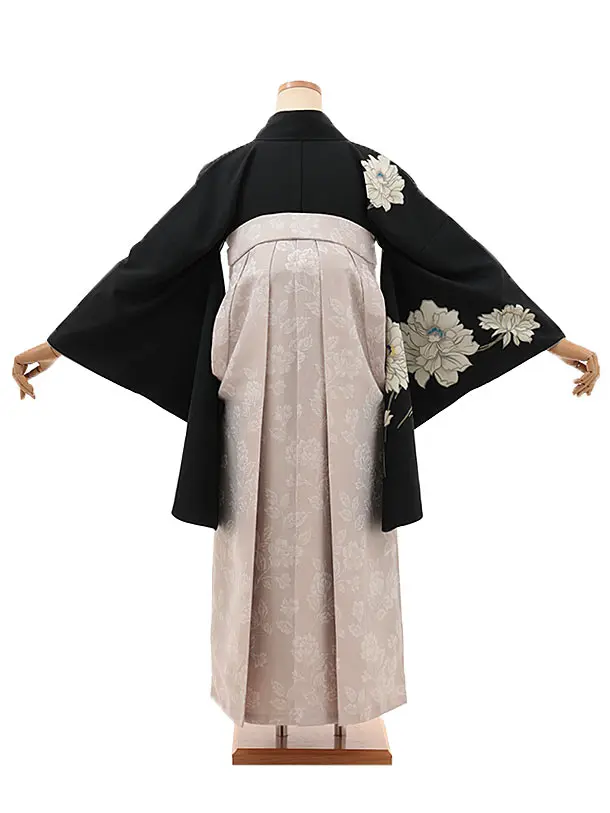 卒業式袴レンタルV337 黒地 花×ピンクベージュ花