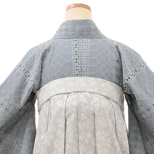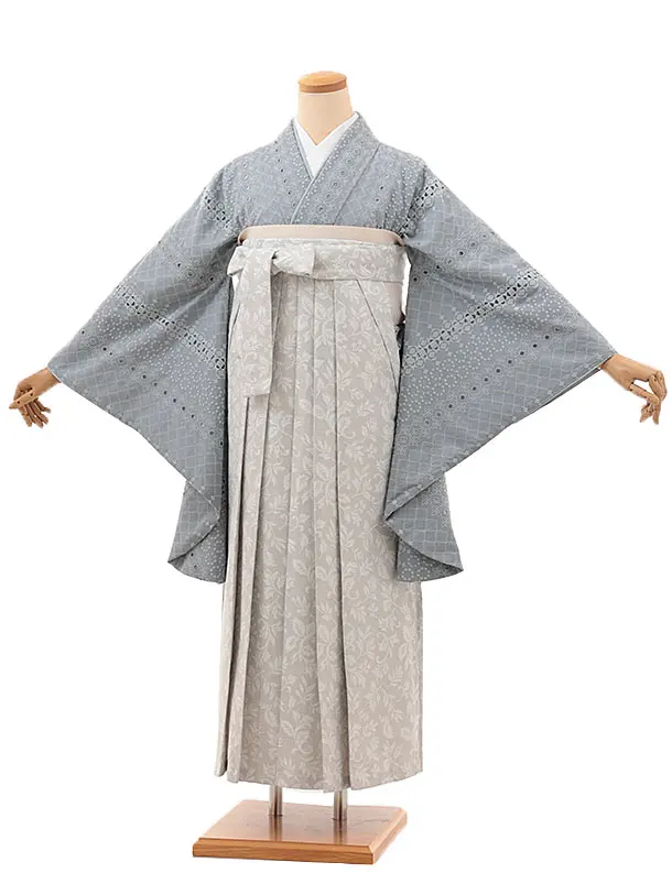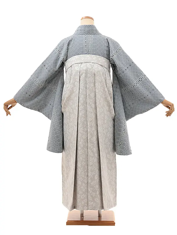 卒業式袴レンタルV370 ブルーグレー レース×薄グレー小花