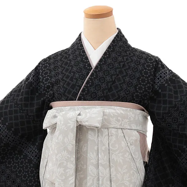 卒業式袴レンタルV373 黒レース×薄グレー小花