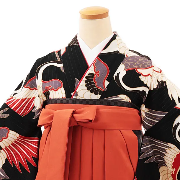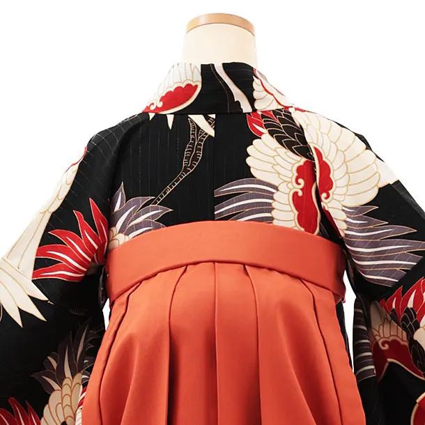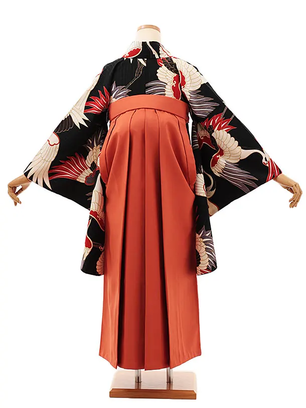 卒業式袴レンタルV381 黒地鶴×テラコッタ