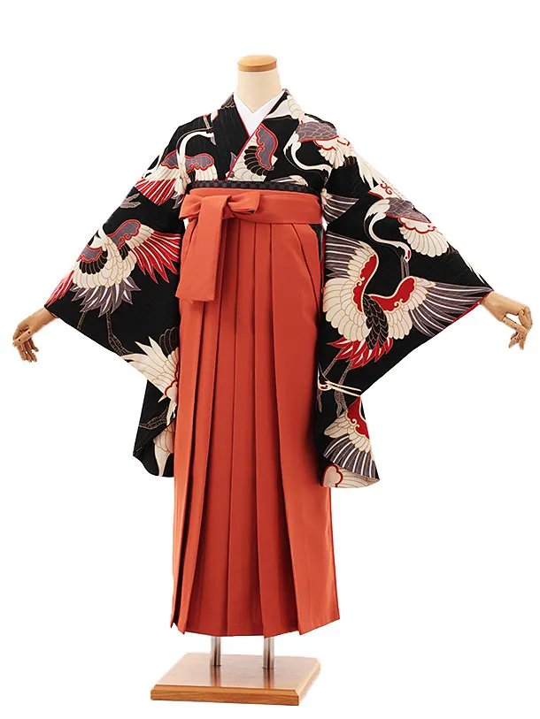 卒業式袴レンタルV382 黒地鶴×テラコッタ