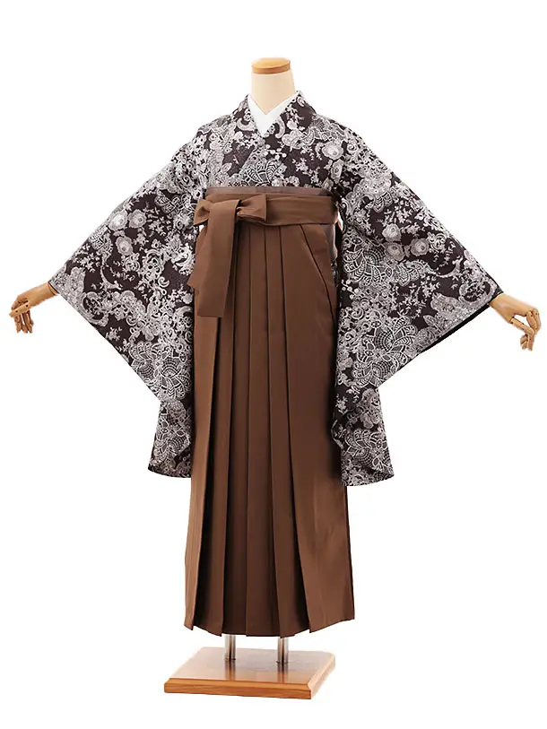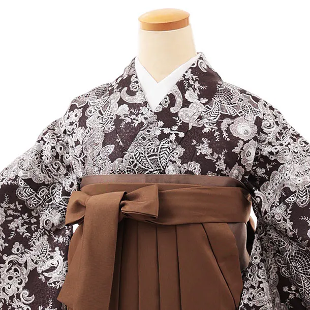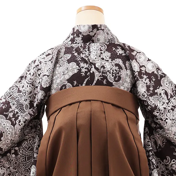 卒業式袴レンタルV396 ブラウンレース柄×ブラウン