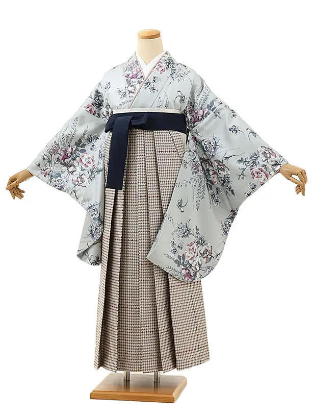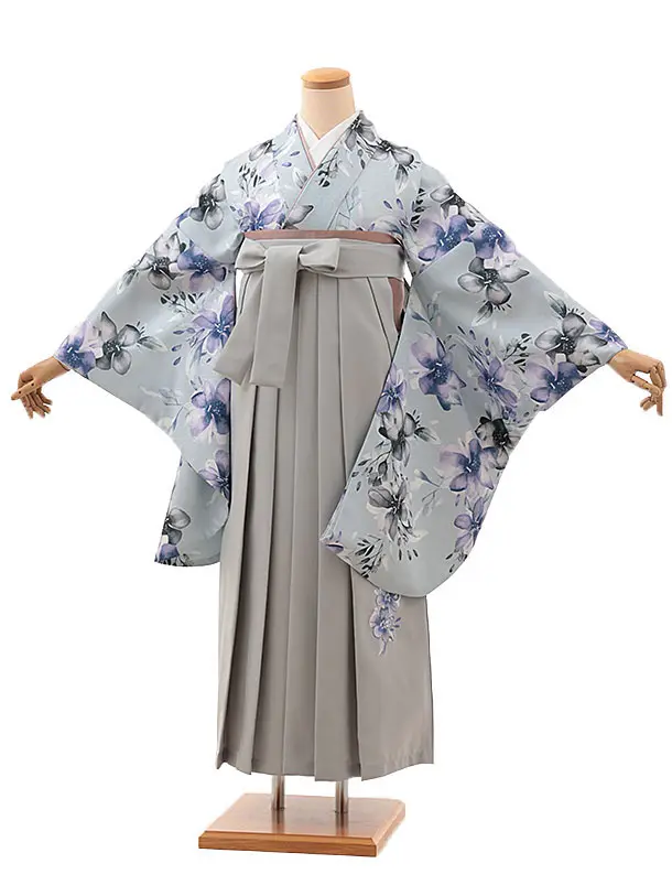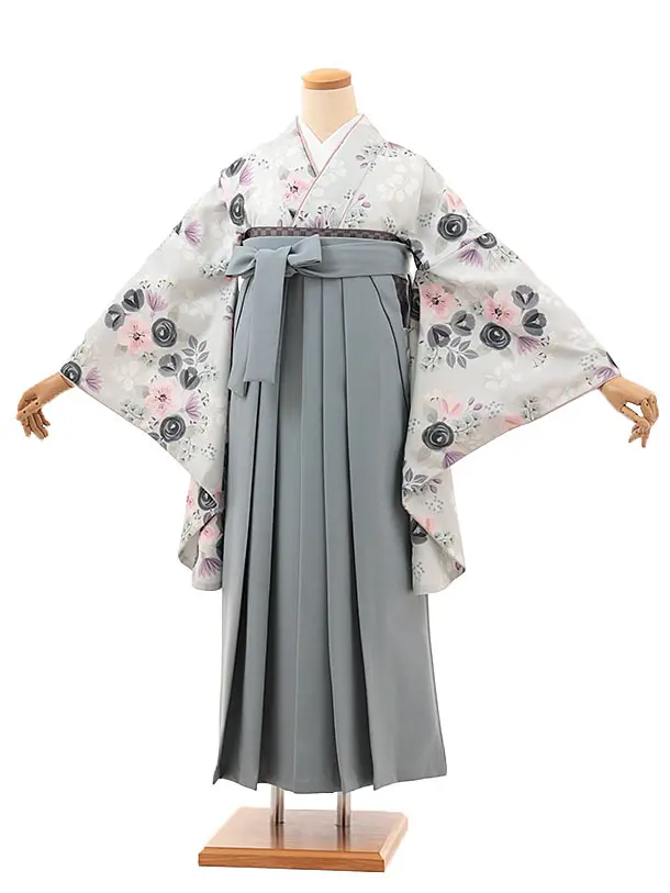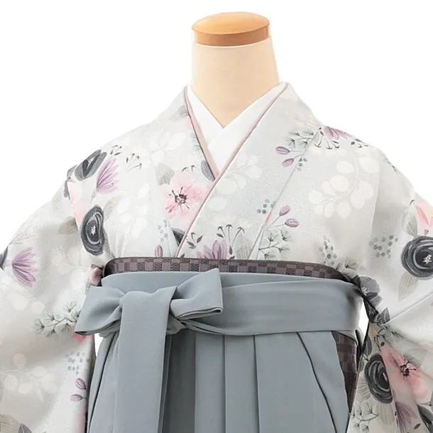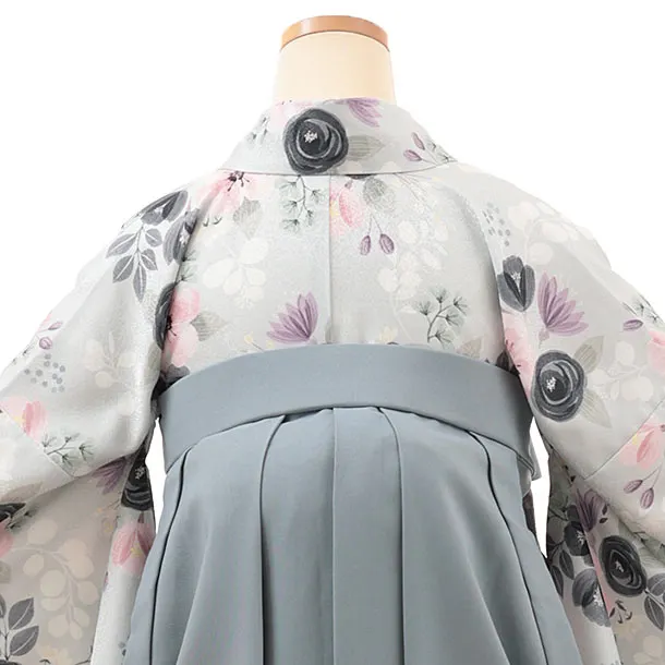 卒業式袴レンタルV470 淡グレー白パステルブーケ×ブルーグレー