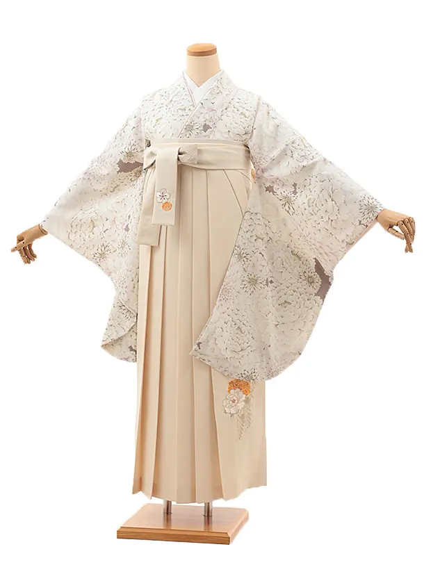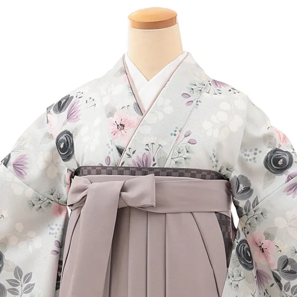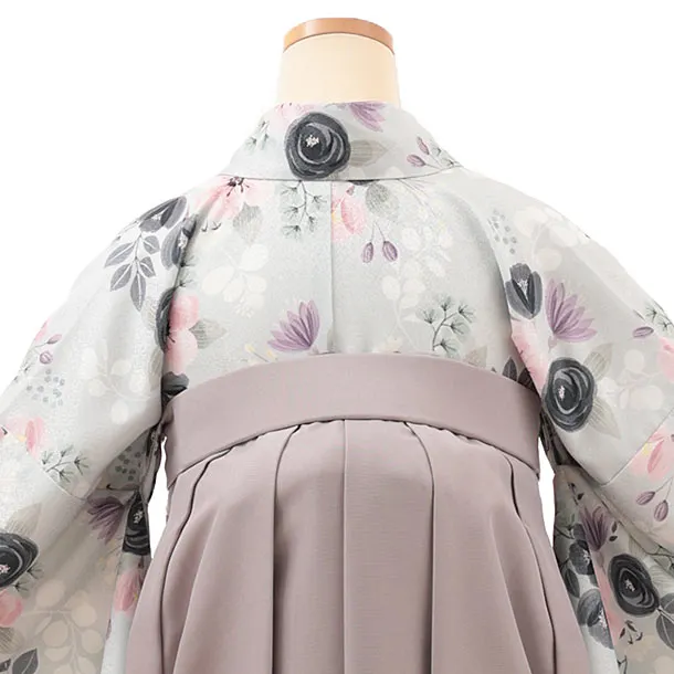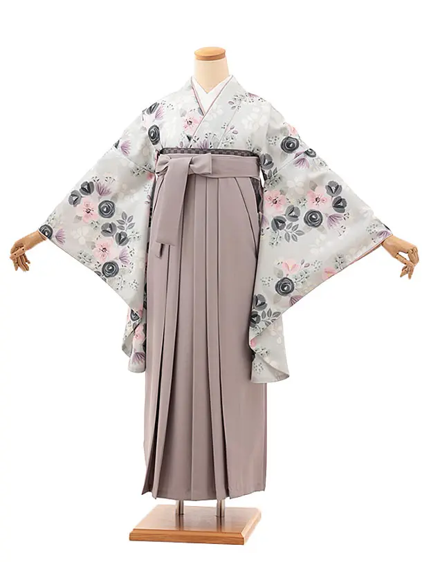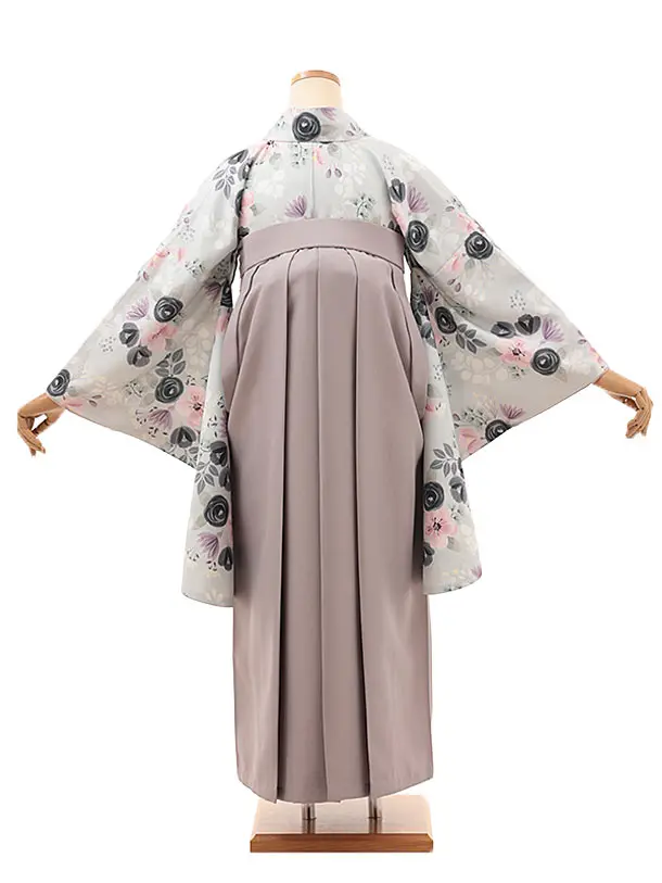 卒業式袴レンタルV472 淡グレー白パステルブーケ×グレージュ