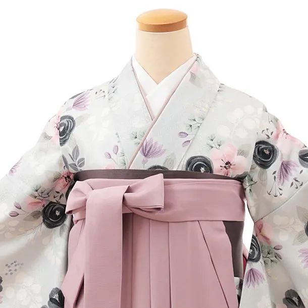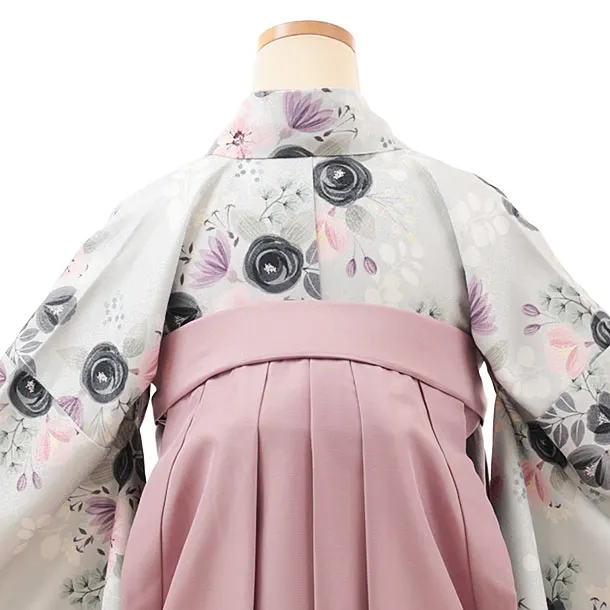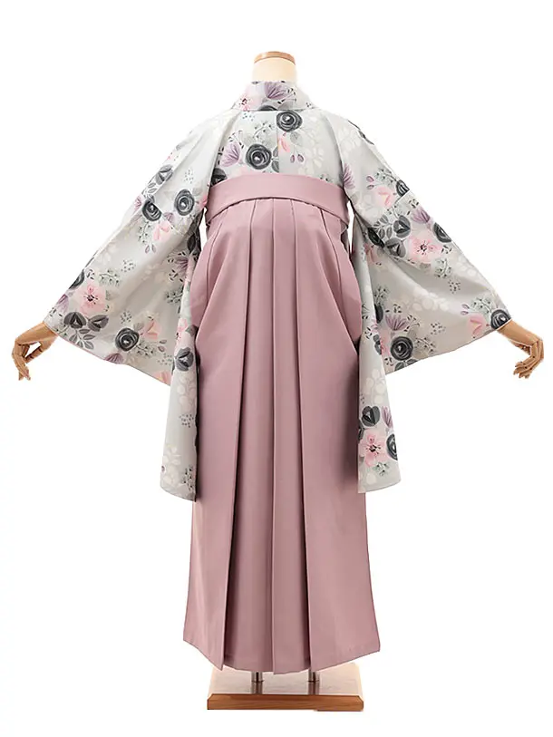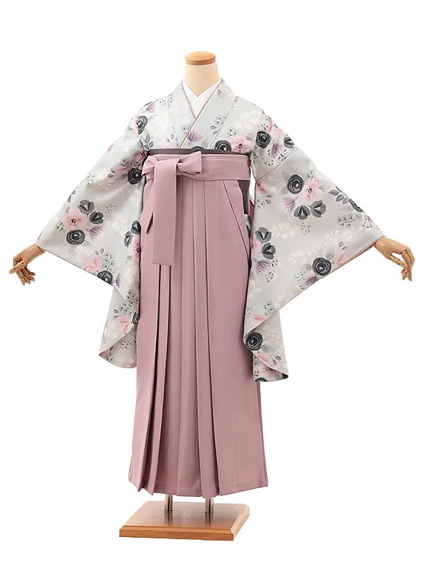 卒業式袴レンタルV491 淡グレーパステルブーケ×ピンクパープル