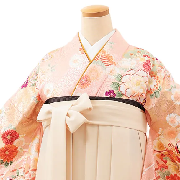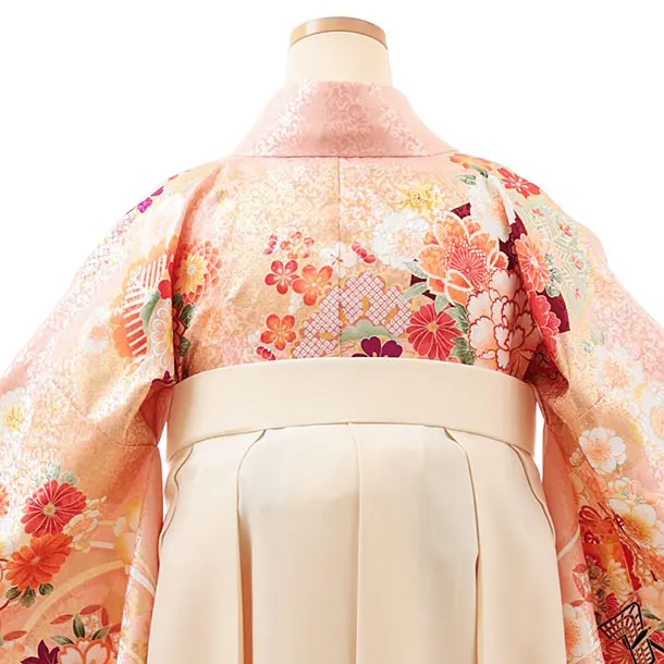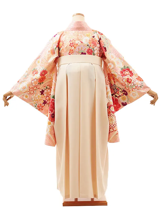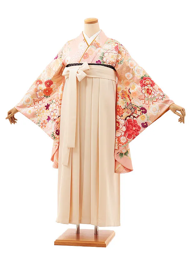 【ふくよかサイズ】卒業袴レンタル V496 ピンク地 御所車に牡丹×アイボリー