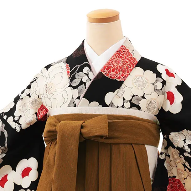 卒業式袴レンタルV521 黒地 花づくし×キャメルブラウンコーデュロイ