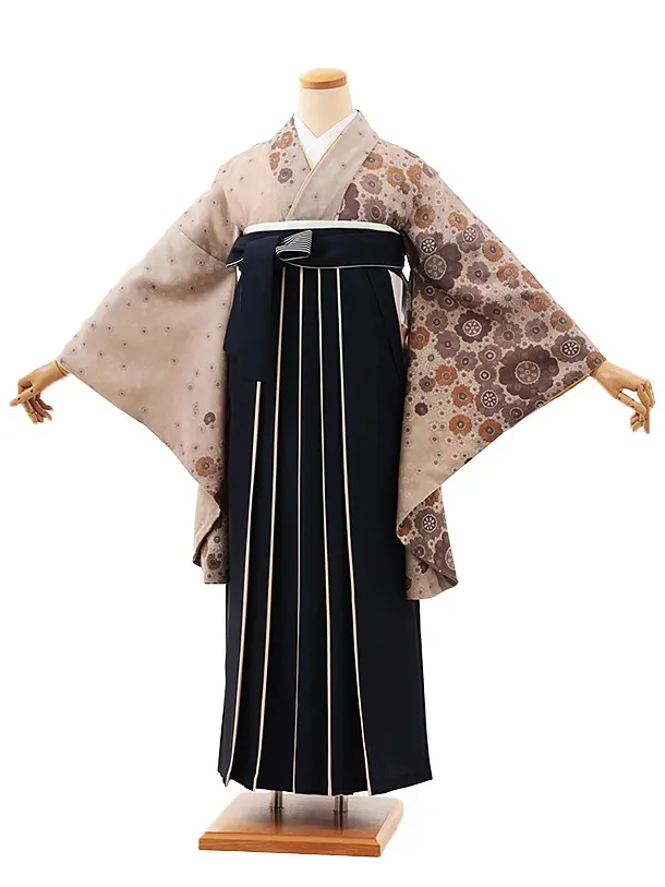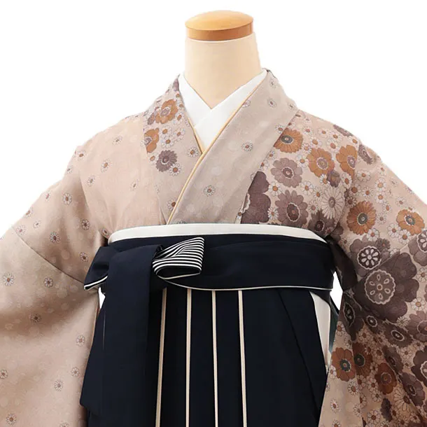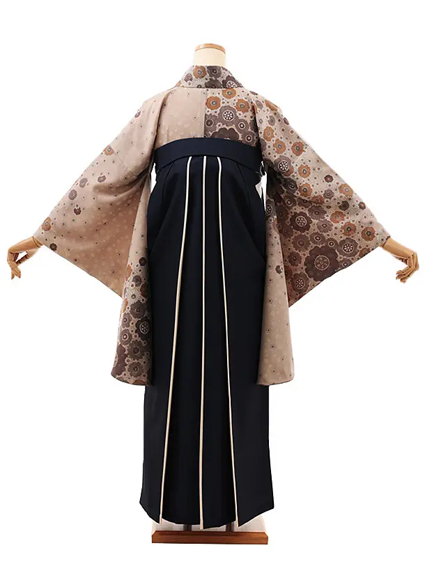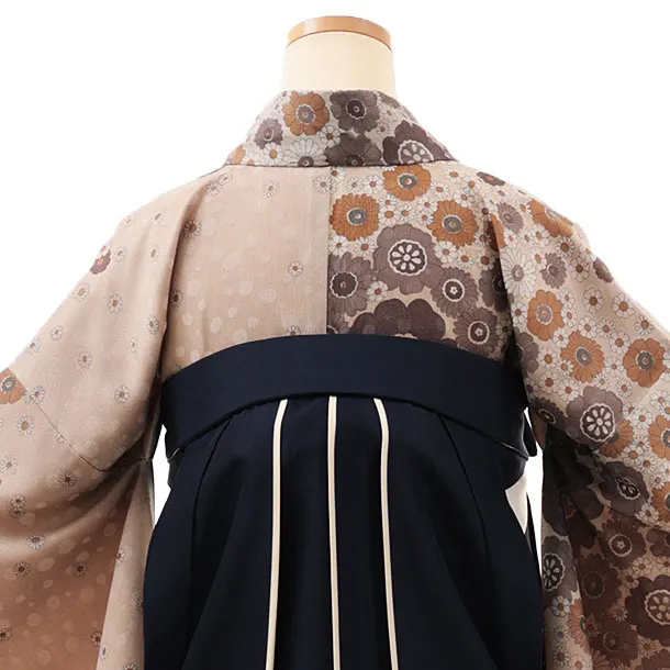 卒業式袴レンタルV544 ベージュ小花×紺アイボリー