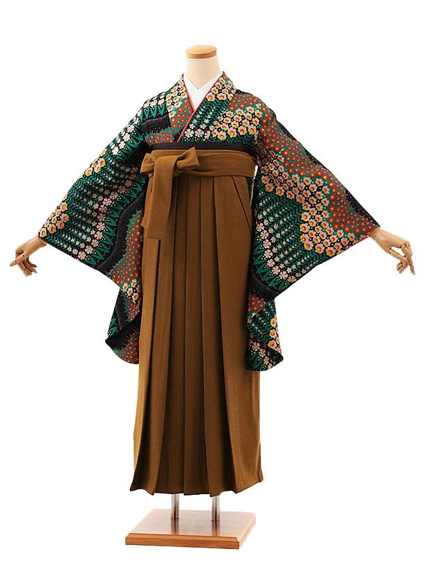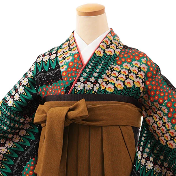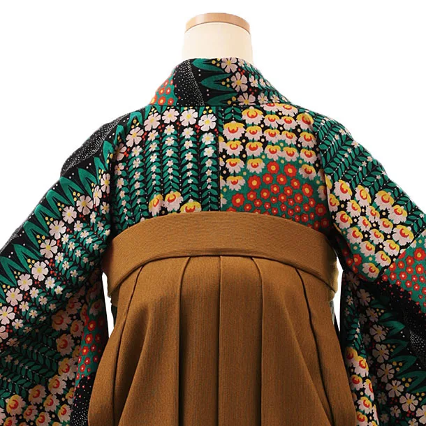 卒業式袴レンタルV550 黒地小花×キャメルブラウンコーデュロイ