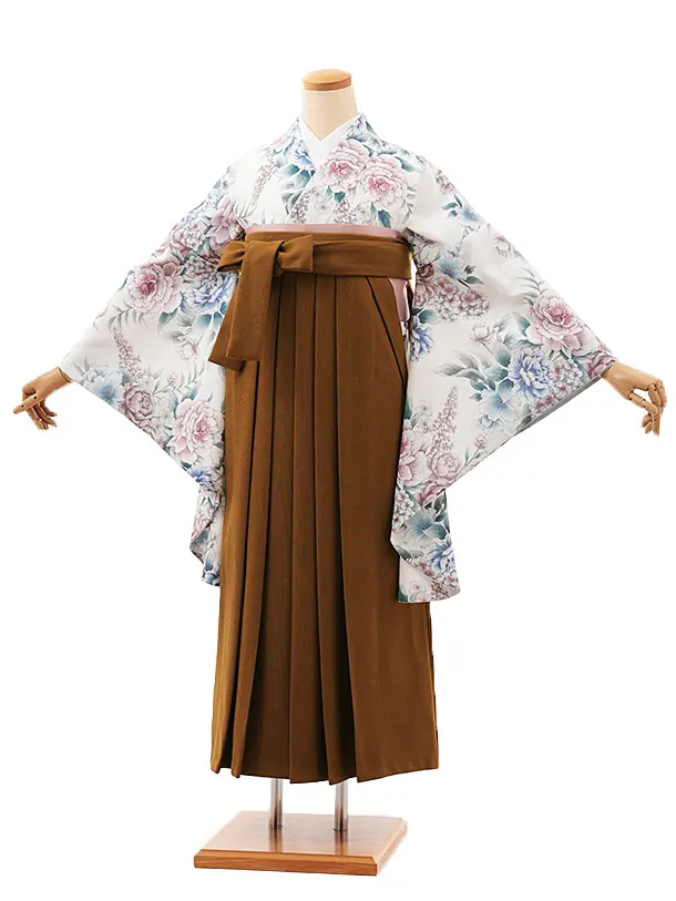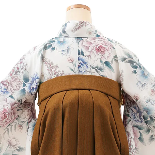 卒業式袴レンタルV563 白地ピンクブーケ×キャメルブラウンコーデュロイ