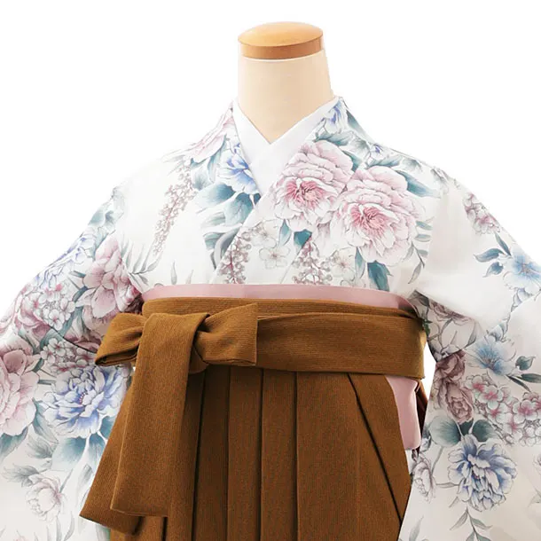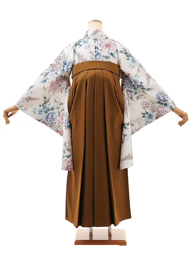卒業式袴レンタルV564 白地ピンクブーケ×キャメルブラウンコーデュロイ