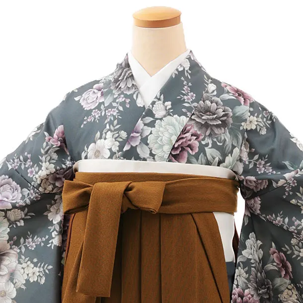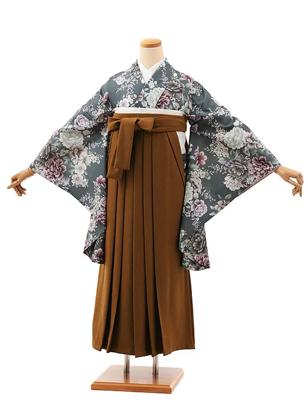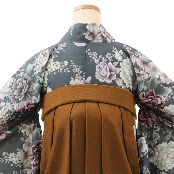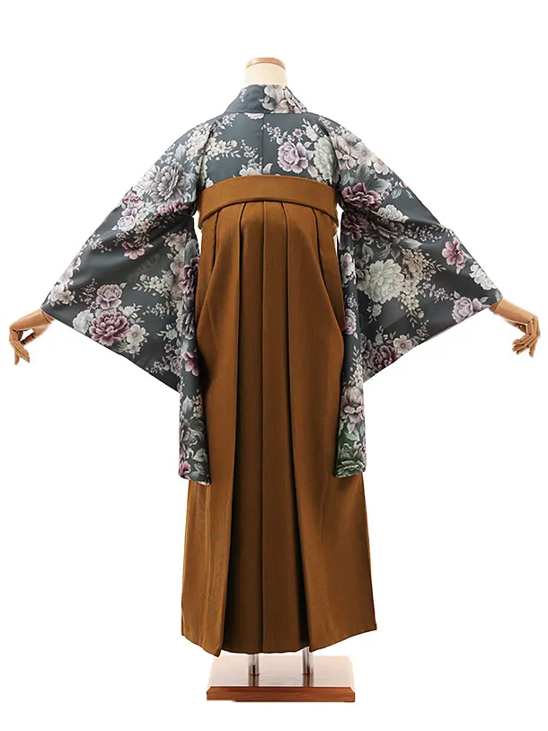 卒業式袴レンタルV568 グレー地ブーケ×キャメルブラウンコーデュロイ