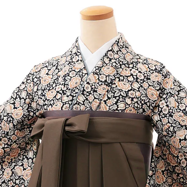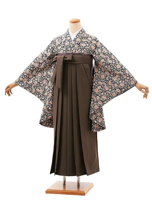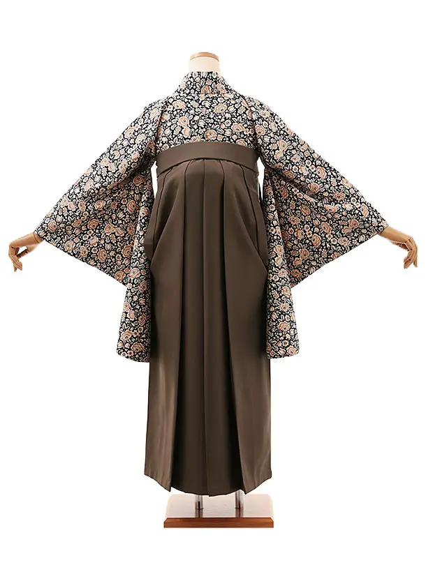 卒業式袴レンタルV578 黒地小花×ブラウン