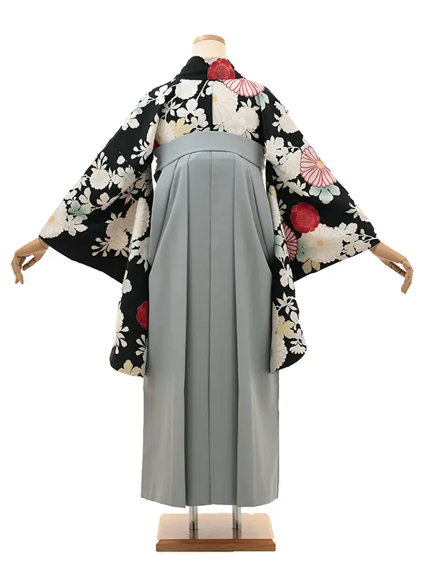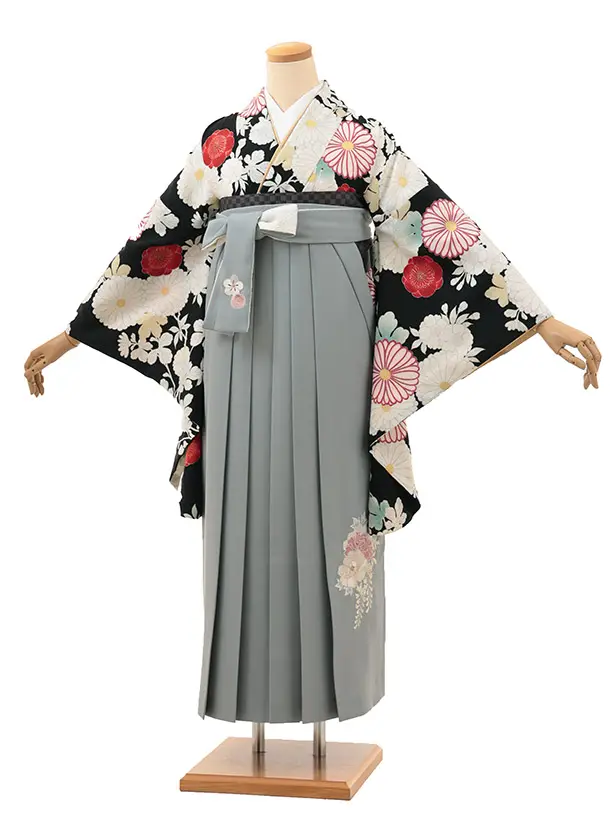 卒業式袴レンタル V592 九重 白菊(黒)×藤牡丹刺繍(グレー)