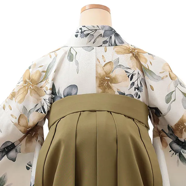 卒業式袴レンタルV601 白地水彩花×オリーブグリーン