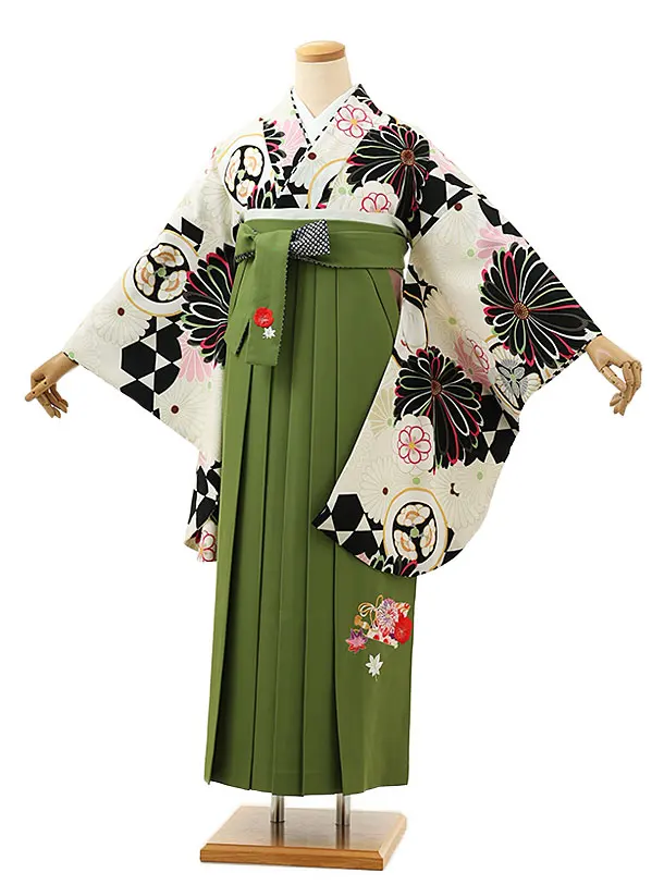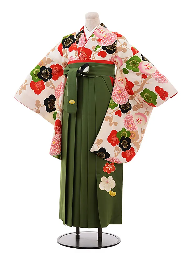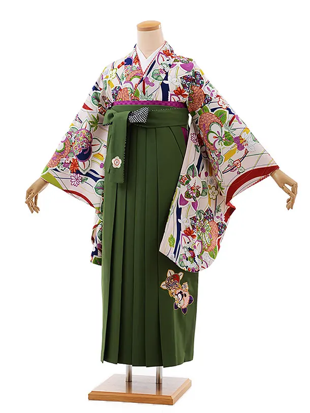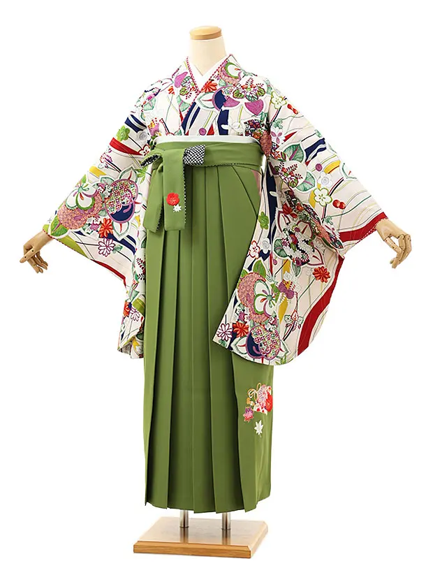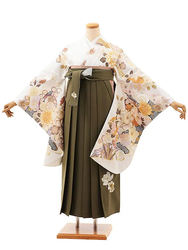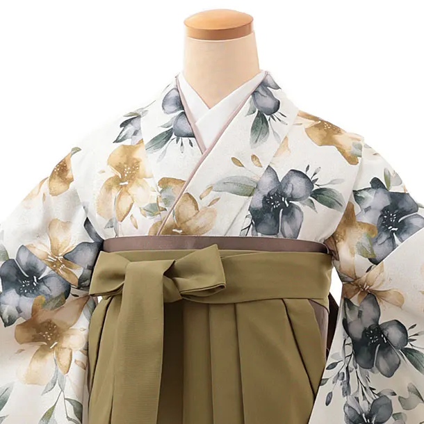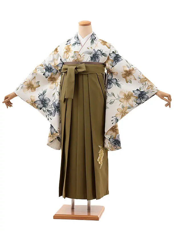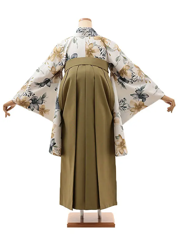 卒業式袴レンタルV602 白地水彩花×オリーブグリーン