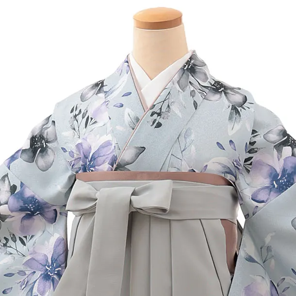 卒業式袴レンタルV605 ブルーグレー水彩花×グレー