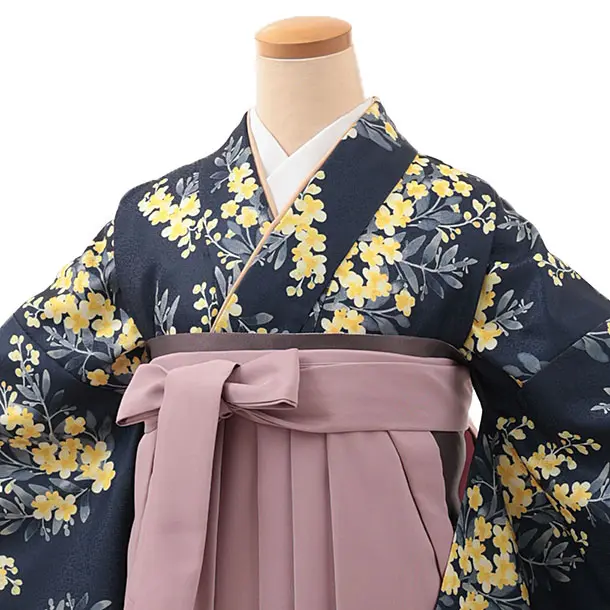 卒業式袴レンタルV610 紺地ミモザ×ピンクパープル