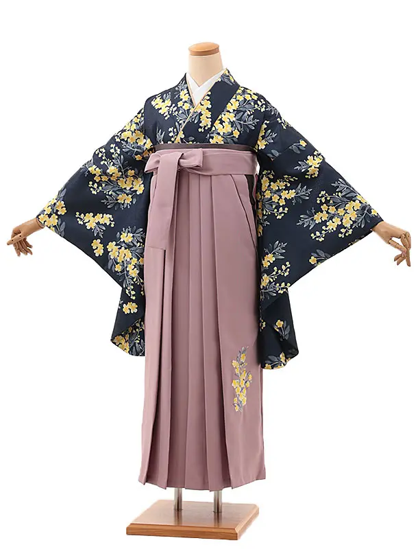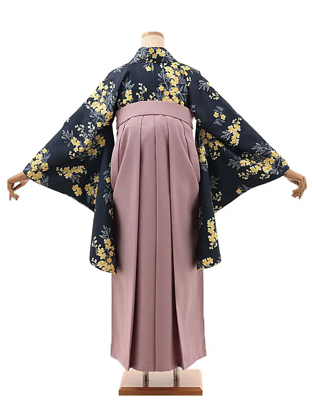 卒業式袴レンタルV611 紺地ミモザ×ピンクパープル
