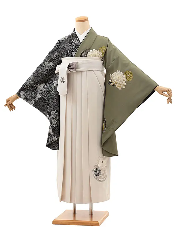 卒業式袴レンタルV629 JAPAN STYLE グリーン片身替り×アイボリー