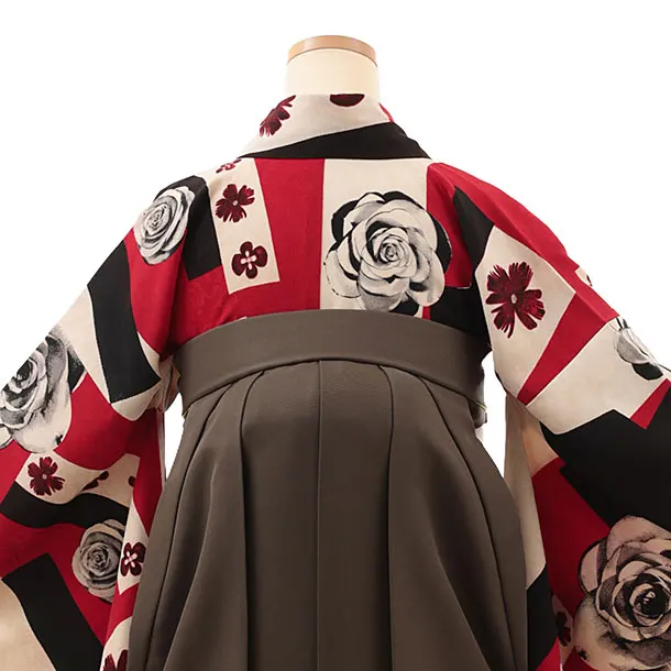 卒業式袴レンタルV637 モダンアンテナ 赤薔薇×カーキイエロー