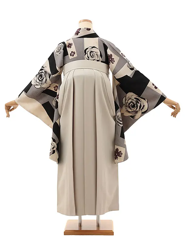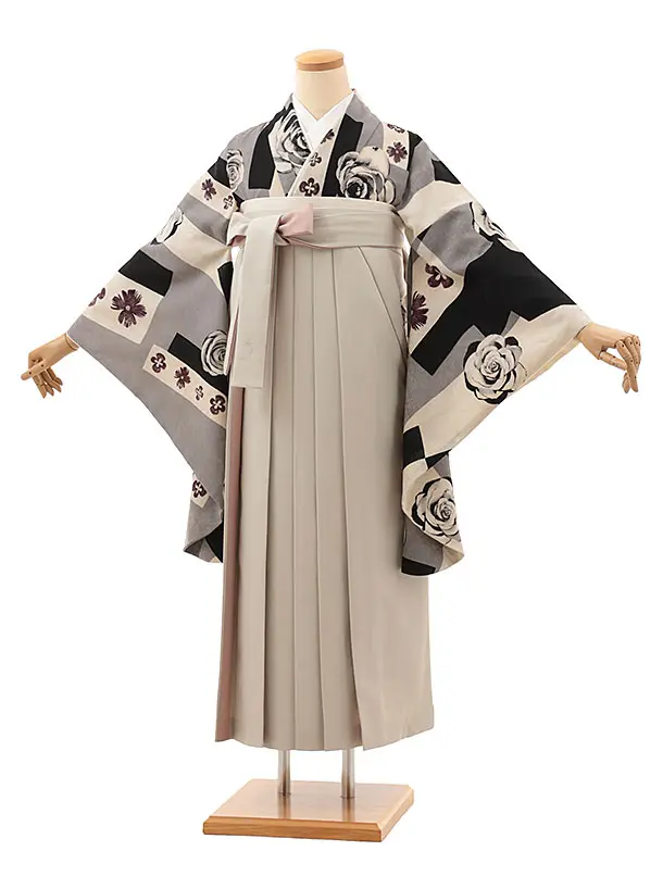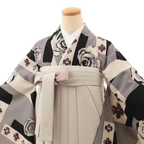 卒業式袴レンタルV639 モダンアンテナ グレー薔薇×ベージュピンク