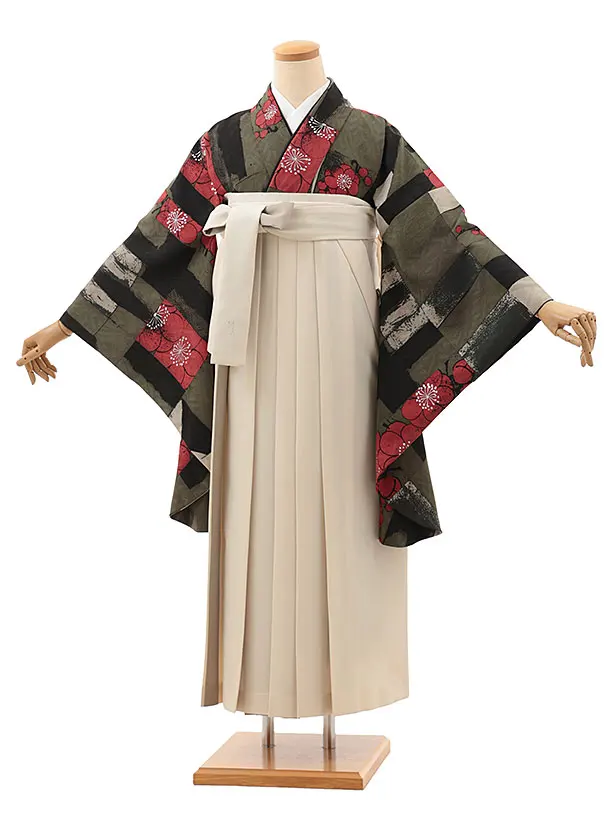卒業式袴V645 モダンアンテナ モスグリーンブラック梅×クリームベージュ