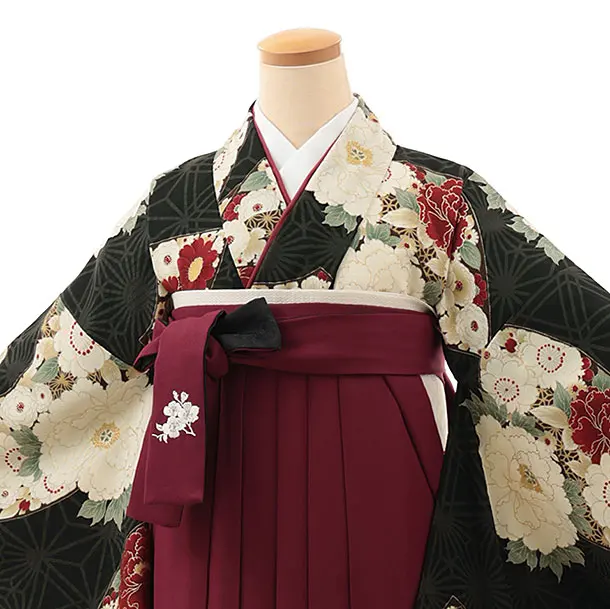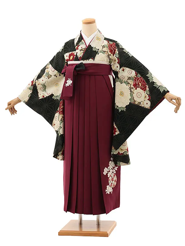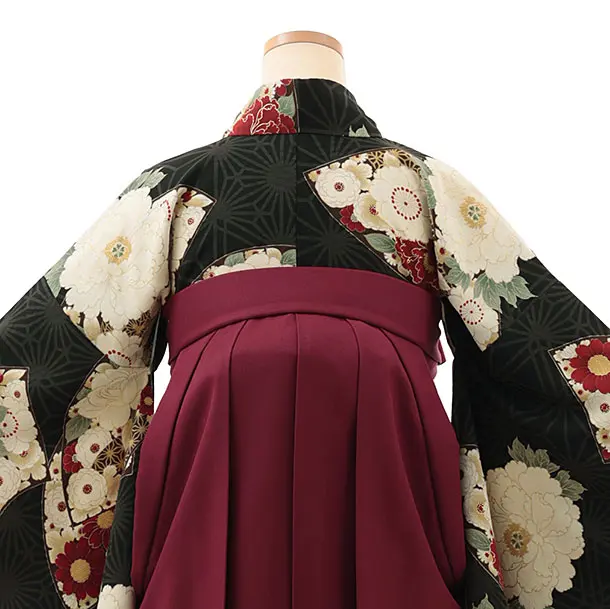卒業式袴レンタルV662 九重 黒牡丹花扇×ボルドー