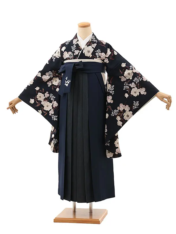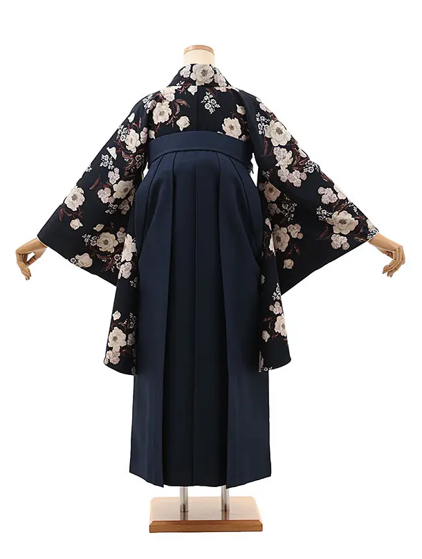 卒業式袴レンタルV674 Heather ネイビーピオニー×デニム切り替え