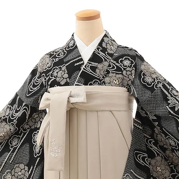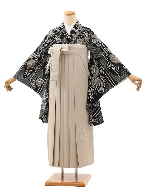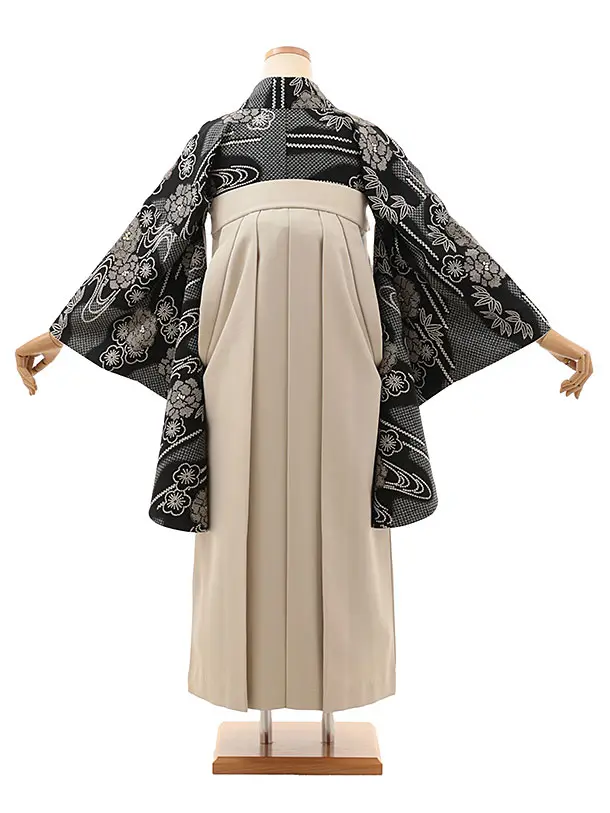 卒業式袴レンタルV683 Heather 黒 流水牡丹×ベージュ