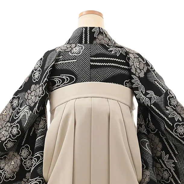卒業式袴レンタルV684 Heather 黒 流水牡丹×ベージュ