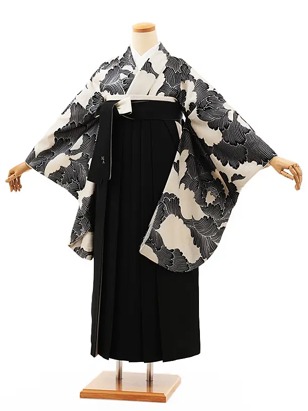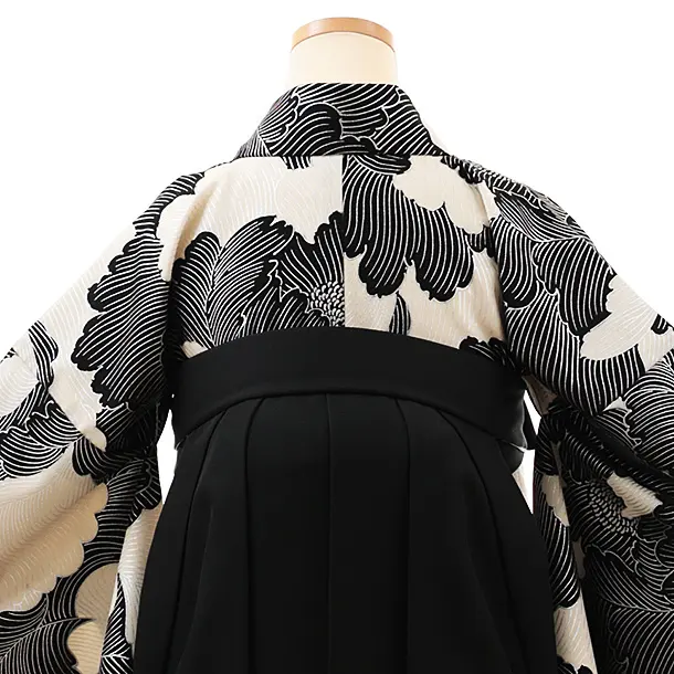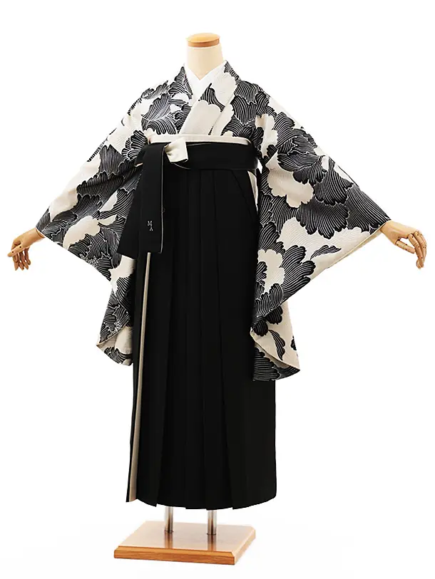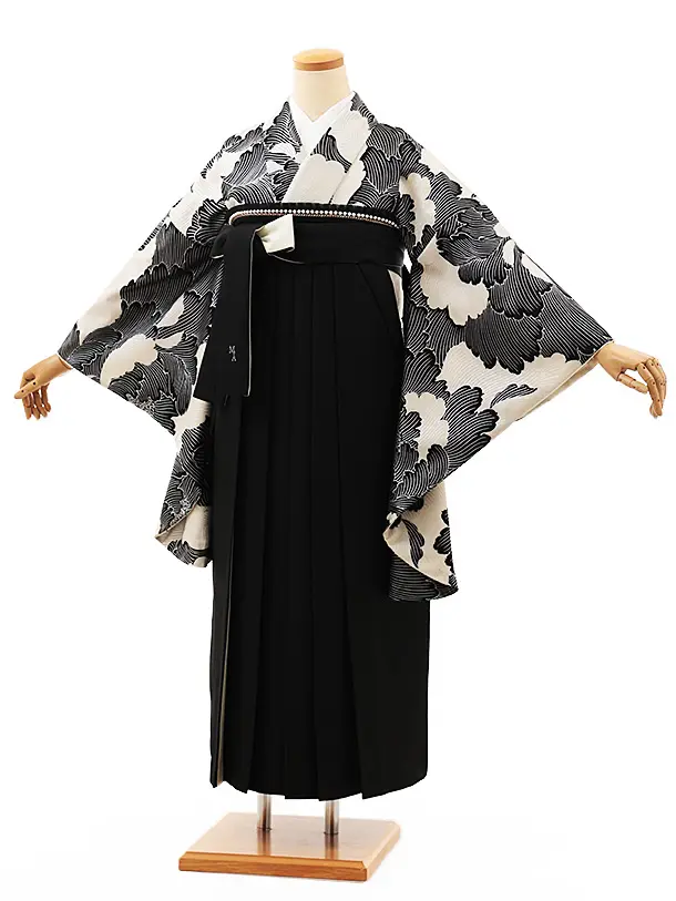 卒業式袴レンタルV715【レース】 モダンアンテナ 黒白シルバー牡丹×黒