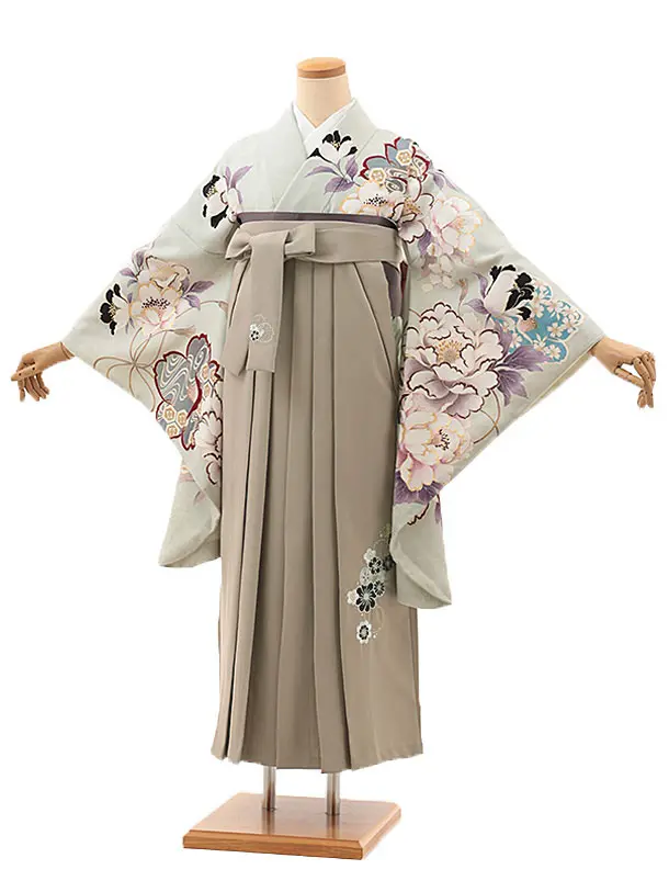 卒業式袴レンタルV727 ペールグリーン地牡丹×モカベージュ