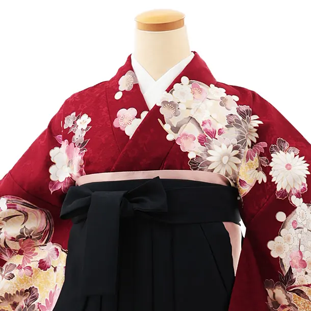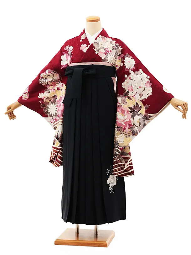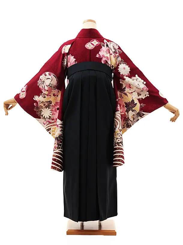 卒業式袴レンタルV744 ワイン地 波花づくし×紺