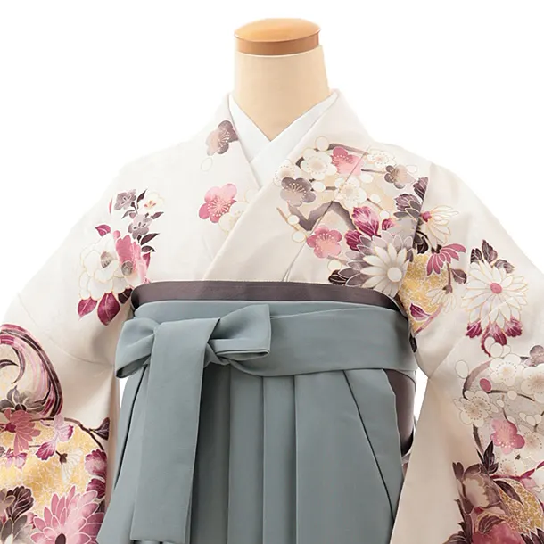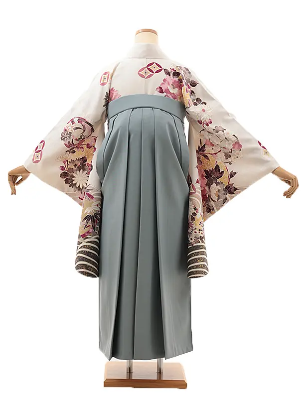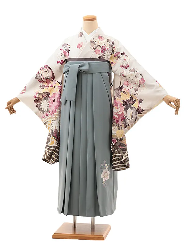 卒業式袴レンタルV746 白地 波花づくし×グレー
