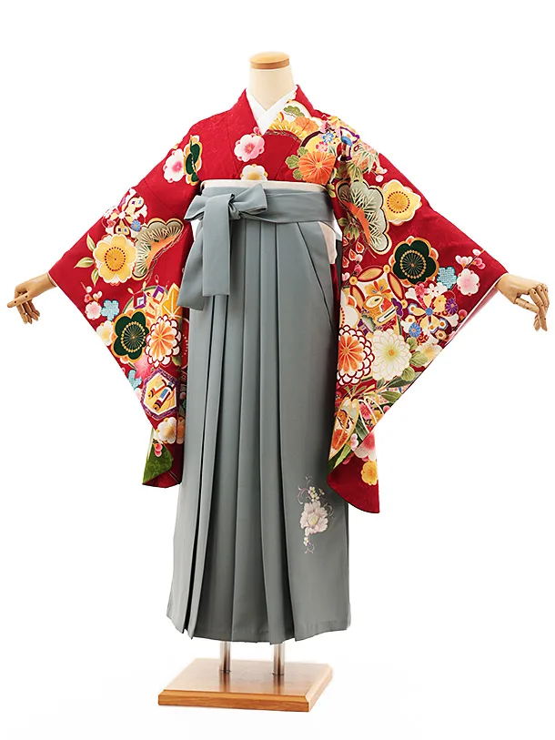 卒業式袴レンタルV752 赤地 古典梅菊×グレー