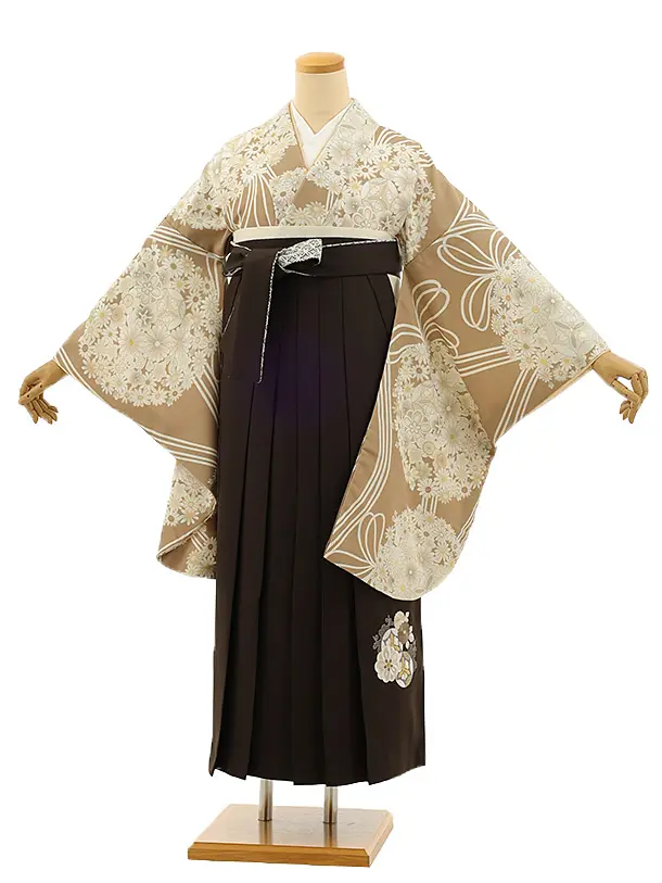 卒業式袴レンタルV758 ブラウン地片身替り花×キャメルブラウン コーデュロイ