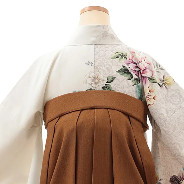卒業式袴レンタルV760 白地片身替り花×キャメルブラウン コーデュロイ