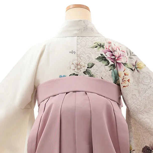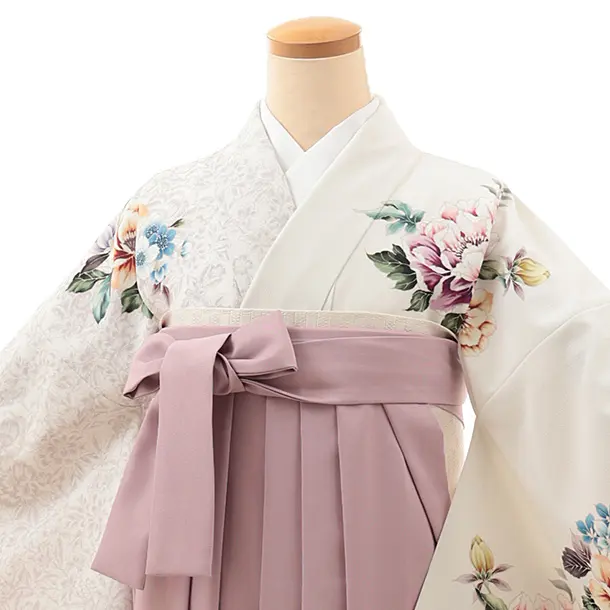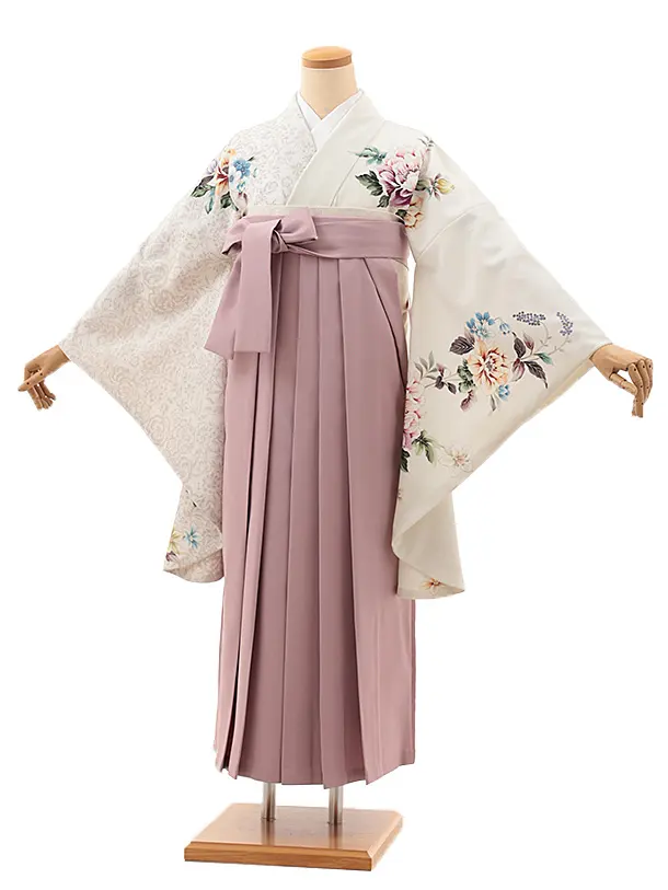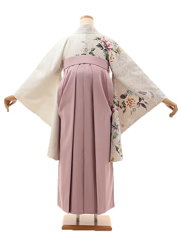 卒業式袴レンタルV762 白地片身替り花×ラベンダーピンク