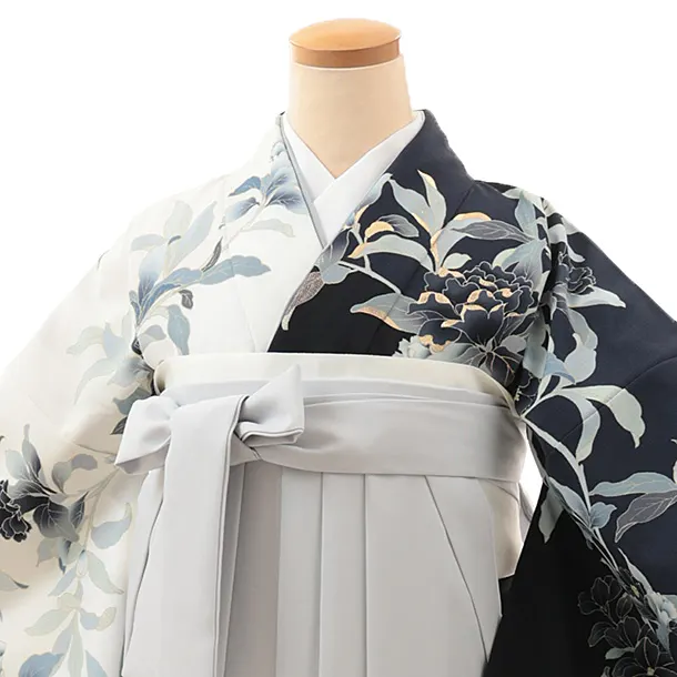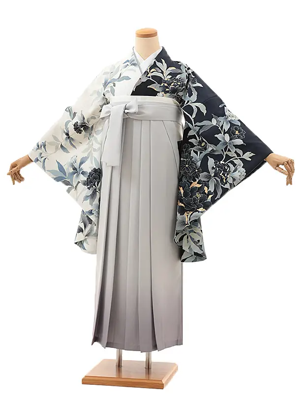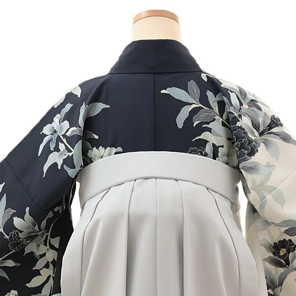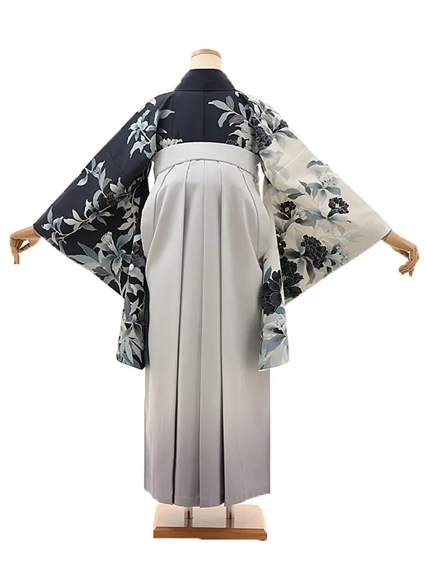 卒業式袴レンタルV772 紺地片身替り枝花×グレーぼかし