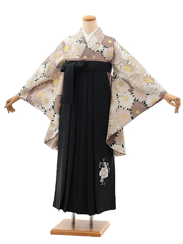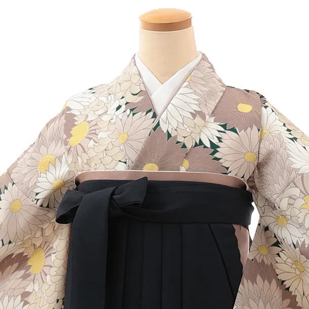 卒業式袴レンタルV776 ベージュ菊花づくし×紺