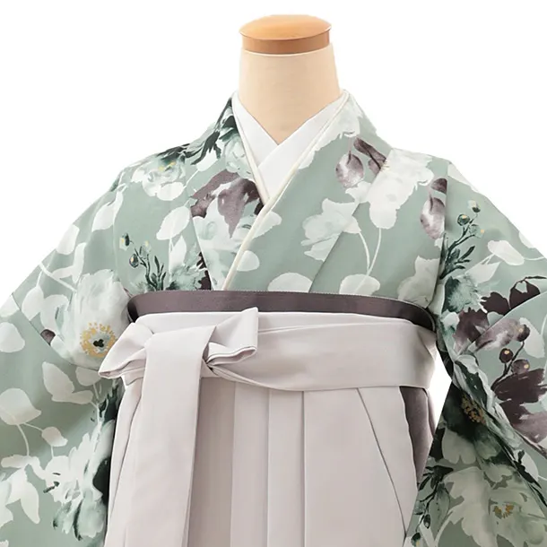 卒業式袴レンタルV784 ペールグリーン水彩花×薄パープルグレーぼかし
