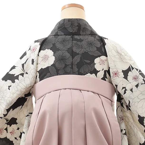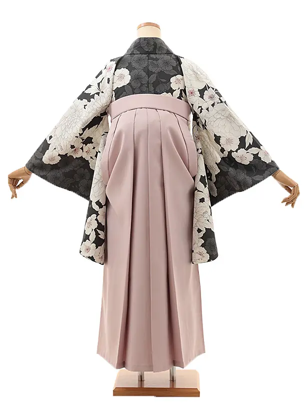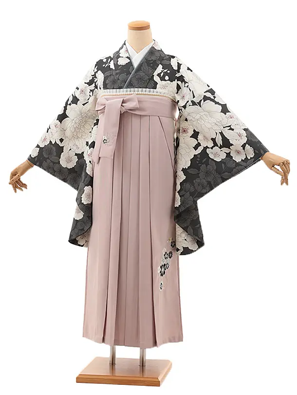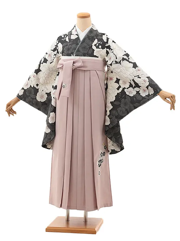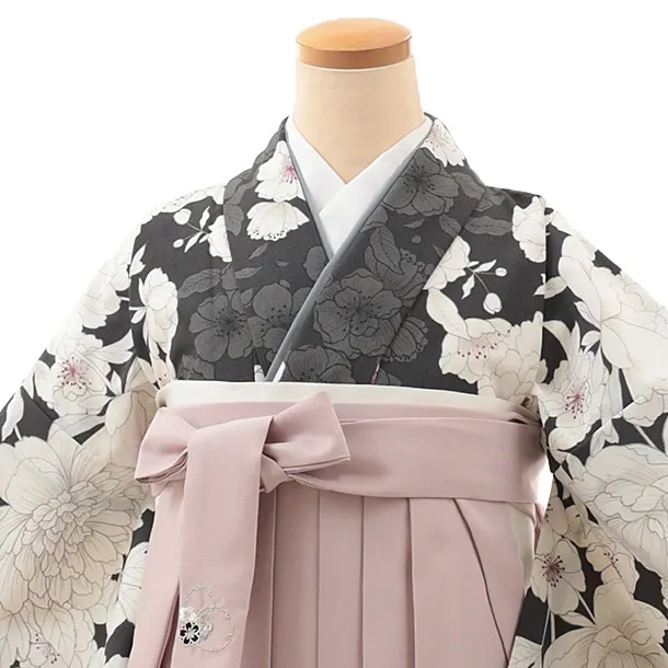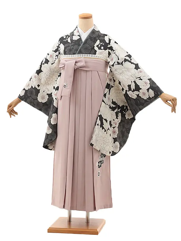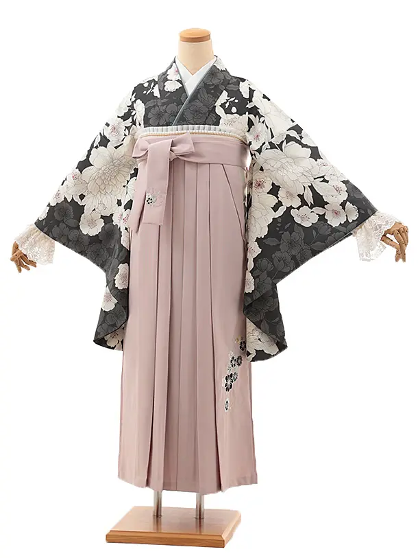 卒業式袴レンタルV788【レース】 チャコールグレー花×ピンク