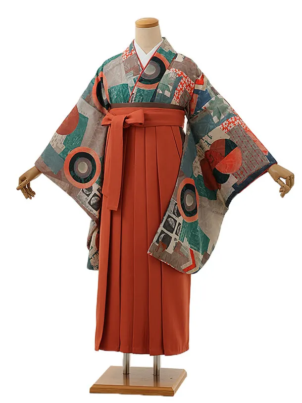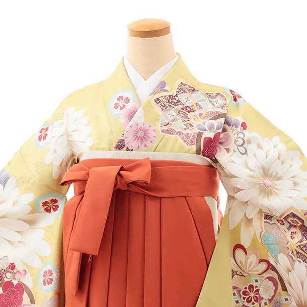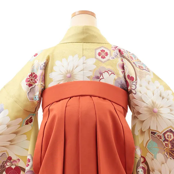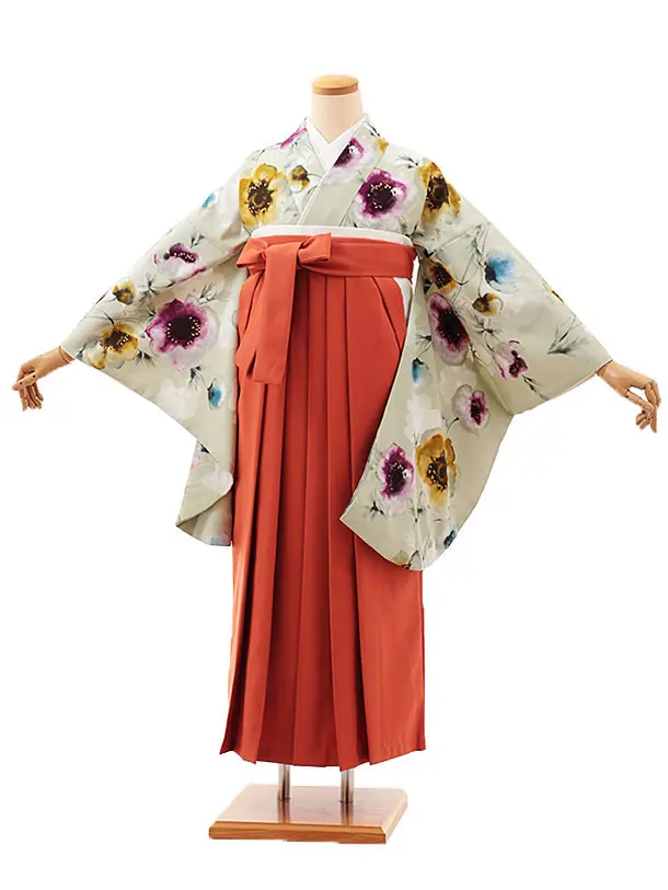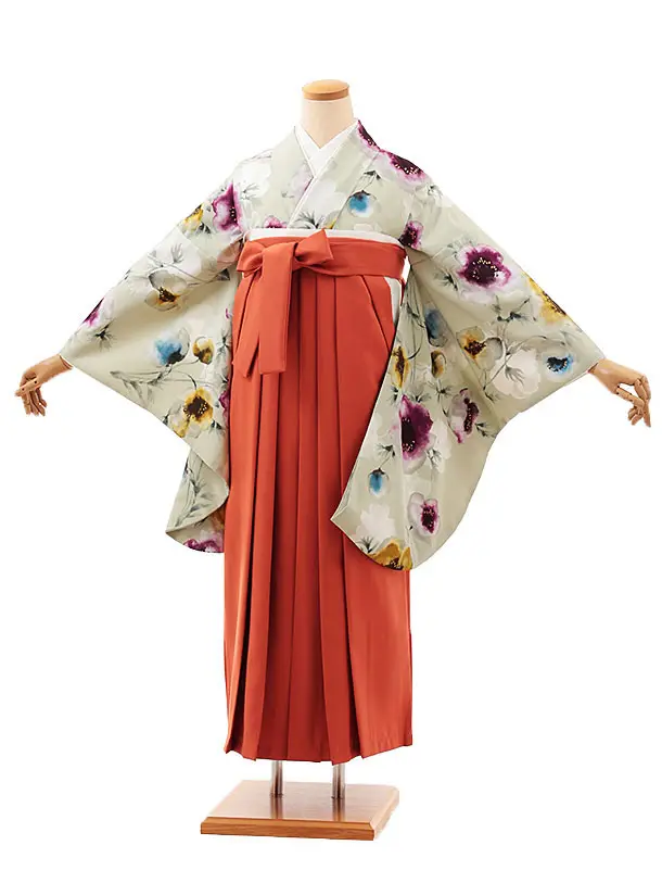 卒業式袴レンタルV825 オリーブグリーン古典花×オレンジ